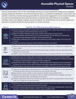 This checklist is designed to help educators create accessible physical spaces by organizing their environment and materials to maximize learning opportunities and promote engagement for every student. It can be used by leaders and educators to evaluate and plan for physical spaces in a school community.