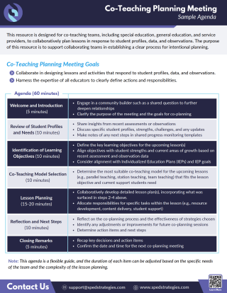 This agenda is designed for co-teaching teams, including special education, general education, and service providers, so they can collaboratively plan lessons in response to student profiles, data, and observations. It can be used by leaders observing or educators engaging in collaborative planning to establish a clear process.